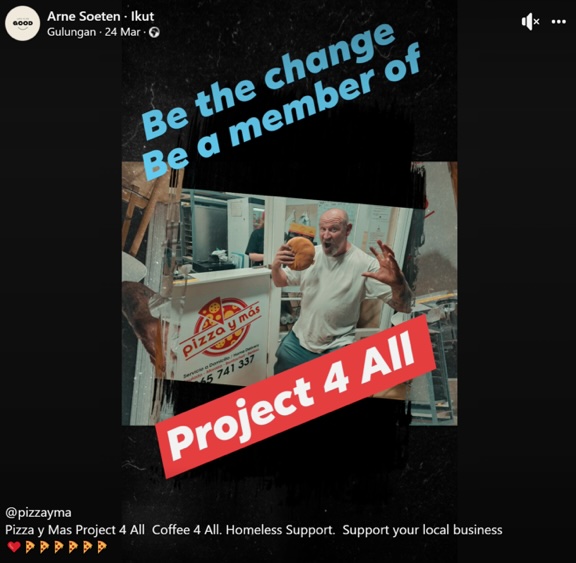 Pizza y Mas cocina para personas sin hogar gracias a donaciones de los clientes. Las donaciones más pequeñas contribuyen a nuestro esfuerzo. Actualmente estamos trabajando cerca con organizaciones como "Project 4 All" y "Coffee 4 All" para ayudar con la distribución. Para donar, simplemente díganos el valor de su donación y entréguenos el efectivo. Incluso 1 euro ayuda. Al ser una pequeña empresa, simplemente no podemos hacerlo sin usted.